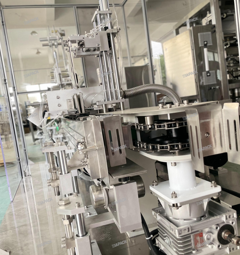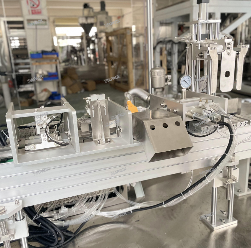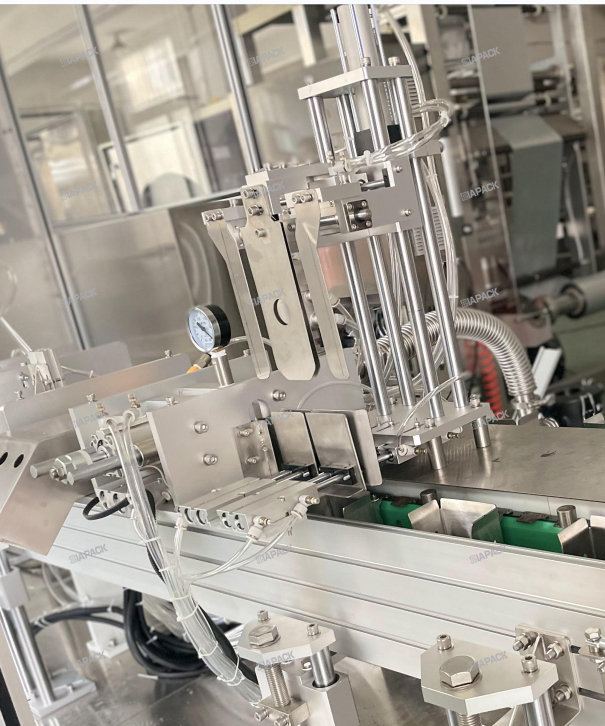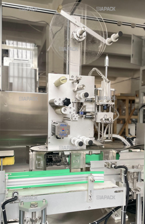 Această mașină are un design special pentru a face punga cu gusset cu etichetare superioară. După ce sacul plin cu picătură de produs pe această mașină. Această mașină va transporta punga, trece printr-o singură pliere a gurii sacului și apoi lipește eticheta. Cadrul mașinii realizat de SUS304. PLC și ecranul tactil adoptă de marca Siemens. Și piesele pneumatice adoptă marca SMC. Componentele electrice principale adoptă mărcile Omron și Schneider. Această mașină lucrează cu o mașină de ambalare automată pentru a ajunge la etichetarea de sus a sacului finit. Această mașină poate atinge automat funcția a etichetei separate ,Trimiterea etichetei .Detectorul de etichete si presarea etichetei .