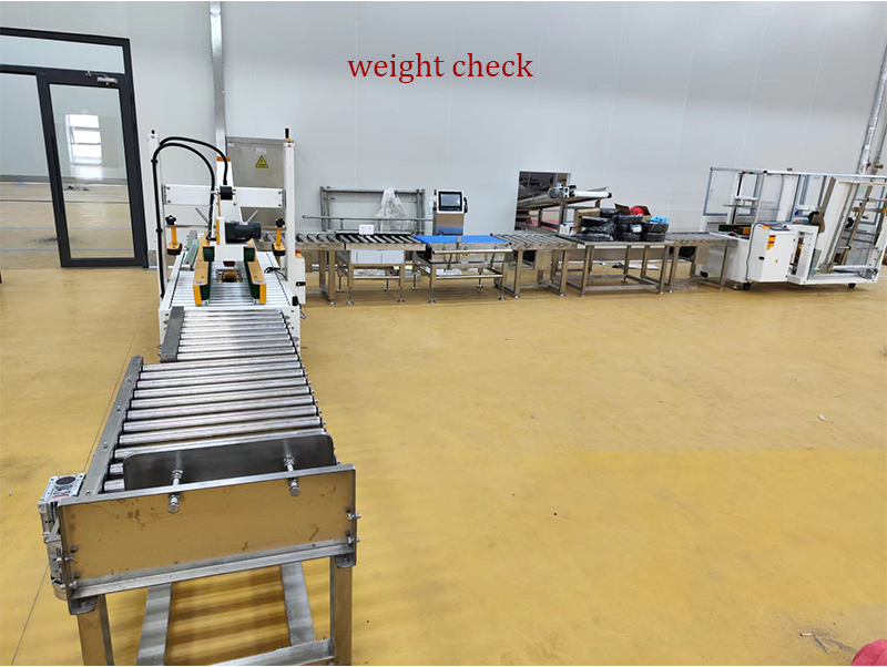 După umplerea pungilor cu alimente congelate, fiecare pungă este re-verificată de un detector de greutate pentru a se asigura că greutatea se potrivește cu greutatea țintă și apoi trece printr-un detector de metale pentru a se asigura că nu se amestecă metal în fiecare pungă. Pungile sunt apoi transportate la linia de umplere a cartonului.