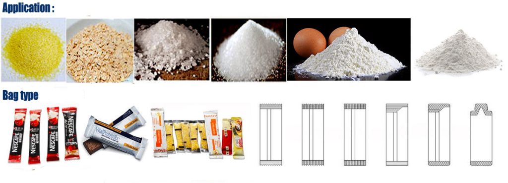 Această mașină este utilizată în principal pentru a împacheta produse din pulbere: lapte praf, lapte praf de ceai, pulbere de cafea, mirodenii, praf de curry, praf proteic, condiment, pulbere de plante, produse chimice și pulbere medicale.