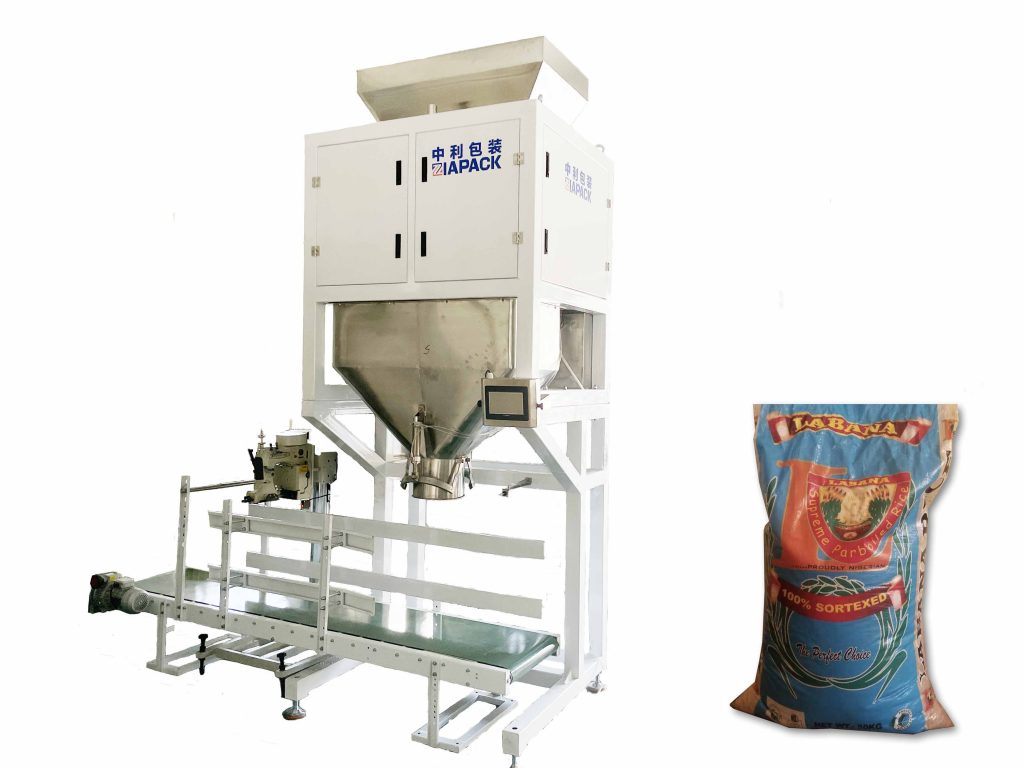 This machine unit including one set double buckets weighing machine for measuring 30-50kg .One set 3meter output conveyor ,one set PE bag heating sealing machine and one set jute bag stitching machine .The whole machine can automatic finish product weighing ,product filling ,automatic bag stitching and heat sealing .Just need manual feeding the bag .